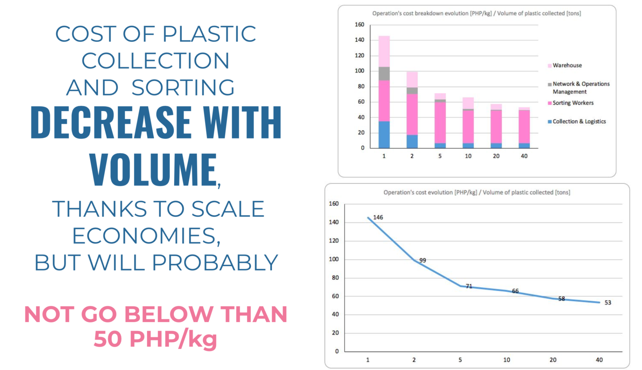 Finally, cost of plastic collection and sorting can decrease with volume, thanks to scale economies. However, based on our computation, it will probably not go below than 50 pesos/kg.